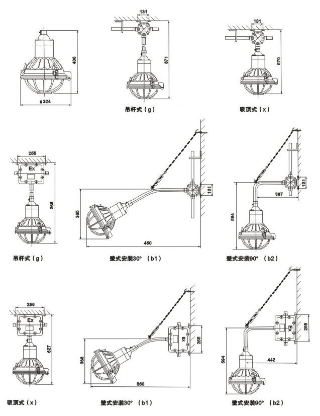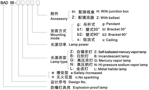 | 防爆标志 | 防护等级 | 防腐等级 | 电缆外径(Φ,mm) | 出线口螺纹(G") | 灯座代号 |
