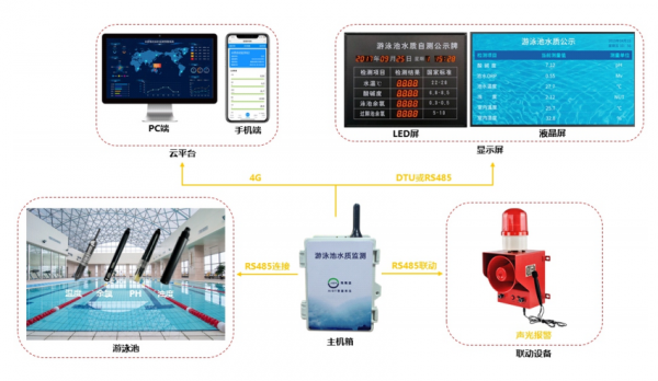 在线检测系统主要包含大屏显示系统、终端显示及控制器、各类型检测的传感器、远程移动端、云端数据平台。主要检测游泳池水体中的各项指标,以及需要控制的设备,同时当出现异常时,可及时告警。