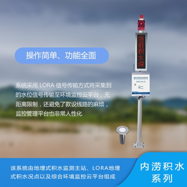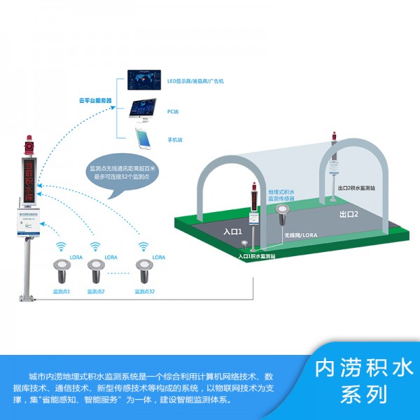 内涝积水监测预警系统由监测主机、立杆支架、供电系统、地埋式积水监测仪、LED双色显示屏以及云平台组成,主要为城市道路、地面、隧道、立交等容易积水的场合提供实时监测及预警服务。