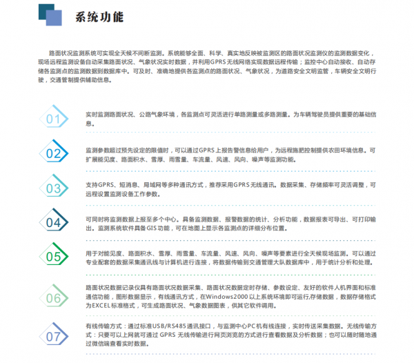 路面状况监测仪应用后,实现道路、高速公路、机场24小时自动化监测,通过对路面状况的监测,为车辆行驶,飞机起飞降落提供了辅助工具,为安全文明驾驶保驾护航,为科学管理道路监督提供决策依据。