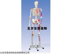 人体骨骼半边肌肉着色附韧带模型示全身骨骼,附着色点着色,右侧附韧带,串制直立。