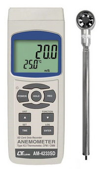 AM-4214SD 记录型热线式风速计 可外接温度探棒,预测温度及空气是否含有黏油 双窗口:同时显示风速值、温度值 反应速度快,可长时间记录于SD卡,不需另接计算机