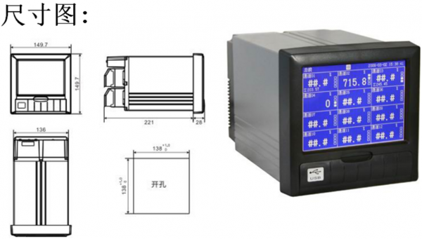 VX5100R系列无纸记录仪面板尺寸:144X144mm;开孔尺寸:138x138mm