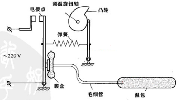 压力式温度传感器在电冰箱沮度控制中的应用原理如图所示。益包、毛细管和弹性膜盒构成的密闭腔中有低沸点的液体氛利昂。电冰箱压缩机以间歇方式工作。每当冰箱内的沮度上升到上限值,温包内压力增加.电接点闭合,压缩机启动制冷,沮度下降;当沮度下降到卞限值,沮包内压力下降,电接点断开,压缩机停止工作.温度的切换值可以通过调温旋钮调节。