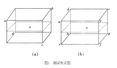 测试点的位置应分布在电阻炉工作室内的3个平面上,称上、中、下三层,中层为通过工作室几何中心平行于底面的工作面,测试点与工作室内壁的距离不小于各边长的1/10,遇风道时,此距离可加大,如电阻炉内有样品架或样品车时,下层测试点可放在样品架或样品车上方10mm处。对实验室用的箱体较小的电阻炉(小于0.2m3),测试点的位置可适当调整,通常放置在电阻炉的中心位置处,或标准热电偶和被校电阻炉热电偶的测量端。测试布点图如图2所示(a为容积小于0.9m3时,b为容积大于0.9m3时)。