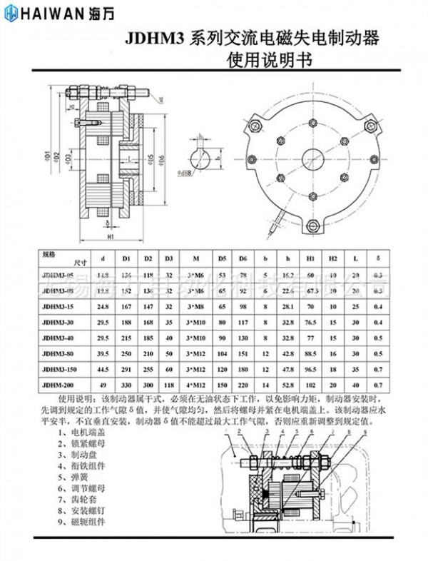 类型: 交流电磁失电制动器 额定电压AC(V): AC380V 型号: JDHM3-05 JDHM3-08 JDHM3-15 JDHM3-30 JDHM3-40 JDHM3-80 JDHM3-150 JDHM3-200 配套YEJ电机机座号:71 80 90 100 112 132 160