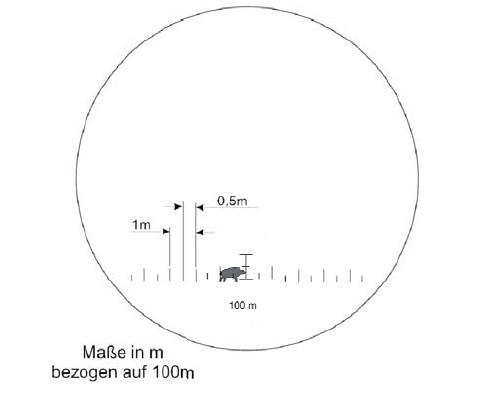 胜利 NV 5.6×62 T* 的十字线特征可用于判定猎物的距离.两个刻度线之间的0.5米即为100米实际距离: 如果一头重75公斤的公猪(大约1米长)从目标处看上去包含两部分, 那么它的距离即为100米远。还可以从动物的身体高度来判定距离. 假如一头公猪的高度相当于一个长记号, 大约它的距离为50米远。