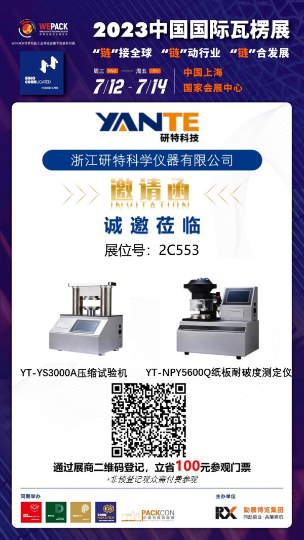 7月12日-14日,2023中国瓦楞展,将在中国上海·国家会展中心举行。研特科仪应邀参展,将携带瓦楞包装检测相关仪器亮相。