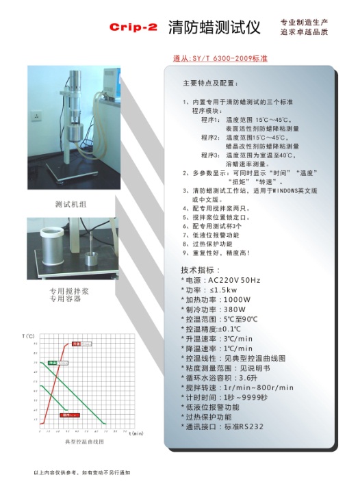 本套测试仪主要用于测定清蜡剂的溶蜡速率和防蜡剂的防蜡率、降粘率等参数。