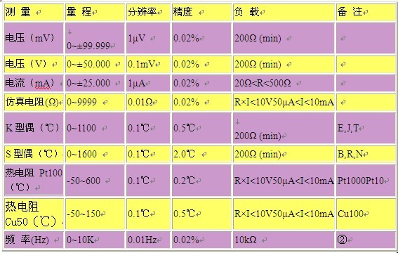 热电偶(K、S、E、T、J、B、R、N) 热电阻(Pt1000*、Pt100、Pt10*、Cu100、Cu50) 仿真电阻(0-1KΩ)