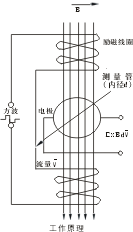 电磁流量计测量原理是基于法拉第电磁感应定律。流量计的测量管是一内衬绝缘材料非导磁合金短管。两只电极沿管径方向穿通壁固定在测量管上。其电极头与衬里内表面基本齐平。励磁线圈由双向方波脉冲劢磁时,将在与测量管轴线垂直的方向上产生一磁通量密度为B的工作磁场。此时,如果具有一定电导率的液体流经测量管,将切割磁力线感应出电动势E。电动势E正比于磁通量密度B,测量管内径d与平均流速V 的乘积。电动势E(流量信号)由电极检出并通过电缆送至转换器。转换器将流量信号放大处理后,可显示流体流量,并能输出脉冲,摸拟电流等信号,用于流量的控制和调节。