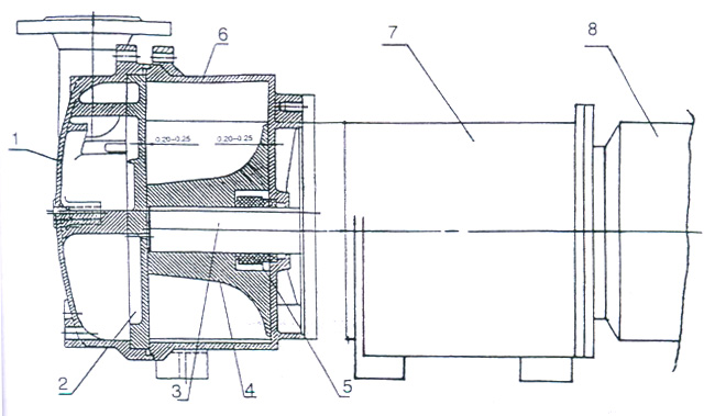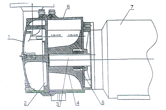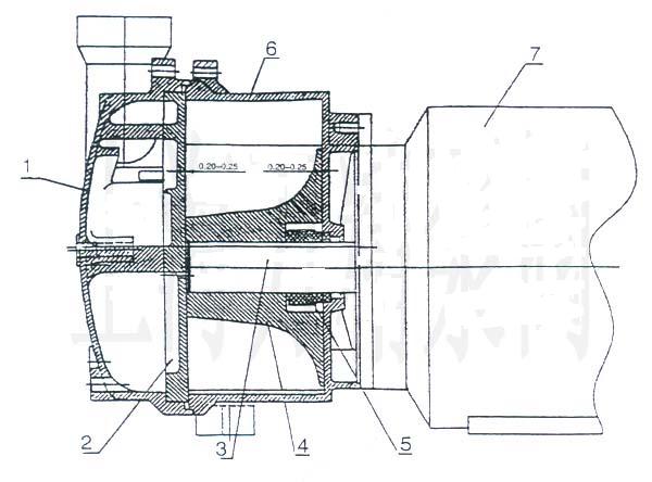 1.泵盖 2.园盘 3.平键 4.叶轮 5.机械密封 6.泵体 7.电动机