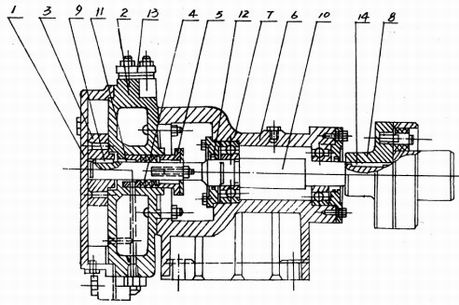 | 1.泵盖 2. 泵体 3. 叶轮 4. 填料 5. 填料压盖 6.托架 7.滚珠轴承 8. 联轴器 9.叶轮平健 10.泵轴 11.填料环 12.轴承压盖 13.法兰盘 14.联轴器平健 |