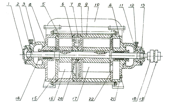 | 1、后轴承压盖 2、轴 3、轴承架 4、前后端盖 5、短泵体 6、中间壁(B) 7、中间壁(A) 8、拉紧螺栓 9、长泵体 10、连通管 11、调整垫 12、油杯 13、前轴承压盖 14、填料压盖 15、后盖园盘 16、短叶轮 17、长叶轮 18、泵联轴器 19、电机联轴器 20、轴套 21、进水孔 22、前盖园盘 |