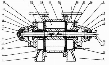 9. 填料压盖 10.填料压圈 11.填料 12.平键 13. 叶轮 14.泵体 15.吸气园盘 16.前轴套 17.前轴承架 18.前轴承压盖 19.平键 20.联轴器 21.进水管