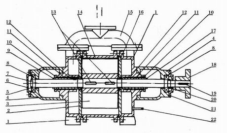 9. 后轴套10.填料压圈 11.填料 12.填料压圈 13.平键 14.泵体 15.连通管 16.前吸排气园盘 17.前轴套 18.联轴器具 19.平键 20.园螺母 21.前轴承压盖