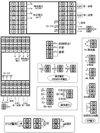 通讯方式为RS-232,输出方式为继电器输出,输入类型为Pt100.1,一报警为上限报警,第二报警为下限报警,DC24V馈电输出,DC24V供电,竖表。