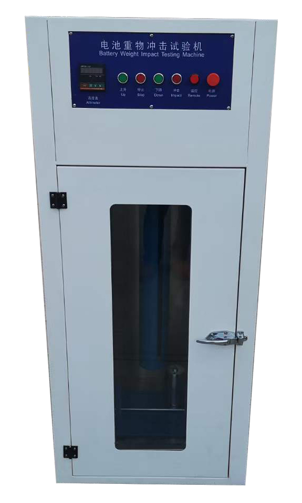 用途/原理:试验样品电池要放在一平面上,一根直径为15.8±0.2mm(5/8英寸)的棒十字交叉放置在样品的中心置上。一个9.1kg或10kg的重物从一定高度(610mm 或1000mm)跌落到样品上。圆柱形或方形电池在接受冲击试验时,其纵轴要平行于平面,垂直于钢柱的纵轴。方形电池的最长轴垂直于钢柱,面垂直于冲击方向,每只电池只接受一次冲击试验。