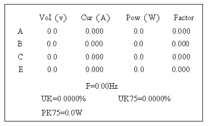 空载及短路试验中A、B、C、字符后的各行分别显示对应各相电压VoI(V)、电流Cur(A)、功率Pow(W)及功率因数Factor,E字符后的一行显示电压平均值VoI(V)、电流平均值Cur(A)、总功率Pow(W)及功率因数Factor。F显示频率、UK显示阻抗电压、UK75 显示在75℃下阻抗电压、PK75显示75℃下短路损耗、io显示空载电流百分数(%)。为完成各功能操作,按键功能如下:4L/3L键:连续按该键,键上的两个指示灯4L/3L循环点亮,当4L指示灯亮,仪表处于“三瓦法”测量:当3L指示灯亮,仪表处于“二瓦法”测量。
