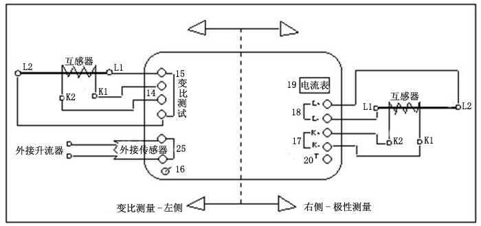 ⒊ 瞬时按一下试验按键“20”(按键的时间要短,否则会缩短仪器的使用寿命),若面板上表头瞬间正偏(即右偏)则被测互感器的一次侧接L+的端头和二次侧接K+的端头为同极性端,反之为非同极性端。(按键断开瞬间的指针指向与按键接通瞬间相反,这是正常现象。)
