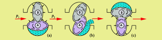 典型椭圆齿流量计的工作原理如图所示:两个椭圆齿轮具有相互滚动进行接触旋转的特殊形状。P1和p2分别表示入口压力和出口压力,显然p1>p2,图(a)下方齿轮在两侧压力差的作用下,产生逆时针方向旋转,为主动轮;上方齿轮因两侧压力相等,不产生旋转力矩,是从动轮,由下方齿轮带动,顺时针方向旋转。在图 (b)位置时,两个齿轮均在差压作用下产生旋转力矩,继续旋转。选装到图 (c)位置时,上方齿轮变为主动轮,下方齿轮则成为从动轮,继续旋转到与图 (a)相同位置,完成一个循环。一次循环动作排出四个由齿轮与壳壁间围成的新月形空腔的流体体积,该体积称作流量计的"循环体积"。