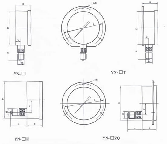HQ-YTN系列耐震压力表 用途说明: 耐震压力表主要用于冶金、电力、石油、化工、轻工、机械等工业部门的压力检测。压力表依靠内部充灌阻尼油和配套缓冲装置等措施。具有良好的耐震性能。适用于被测介质的压力有强烈脉冲变化或压力冲击和在生产工艺中经常突然卸何的场合,以及环境震动较大的场所。仪表能测气体、液体脉动压力的平均值。以克服介质强烈脉冲及环境震动对仪表带来的损害,确保读数的准确性。 耐震压力表技术参数: 使用工作温度:-5℃~55℃;-25℃~55℃ 耐震压力表外形尺寸: