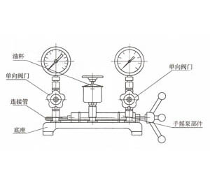基本机构与工作原理 效验器系由手摇泵(1)油杯(2)和两个单向阀(3)组成,彼此用导管(4)相连,都固定在底座(5)上,阀(3)上装有两端索母M20*1.5,用以连接标准压力表和被检验的压力表,检验器净重12公斤。 |