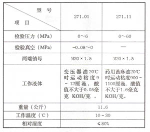 271.01型压力表校验器, 271.11压力表校验器 主要用于计量室,实验室以及生产或科学实验环节,作为压力校验装置使用。 271.01型量程范围: -0.08~6MPa. 271.11量程范围:0-60MPa