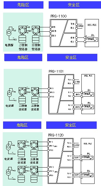 隔离栅_PRG-1100该产品需要供电,电源、输入和输出间全隔离。 是一款二线制,三线制变送器,电流源输入检测端隔离式安全栅,给危险区