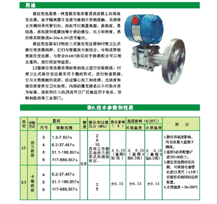 液位变送器是一种直接安装在管道或容器上的现场变送器。由于隔离膜片直接与液相介质相接触,无须将正压侧用导压管引出,因此可以测量高温、高粘度、易结晶、易沉淀和强腐蚀等介质的液位、压力和密度,然后将其转换成4~20mA.DC信号输出。液位变送器有LT型法兰式液位变送器和ST型卫生式液位变送器两种,它们与智能放大板组合,可构成智能型液位变送器,与符合HART协议的手操器配合,可以互相通讯,进行设定和监控。LT型液位变送器采用标准的法兰进行安装联接;ST型卫生式液位变送器采用卡箍的形式,进行快速联接,它与介质接触的表面,经过精细加工和处理,光洁度和清洁度皆符合卫生标准,内部的灌充液是以不污染介质为标准,选取和注入的,因此可以广泛地应用于食品、饮料和医药等工业部门。