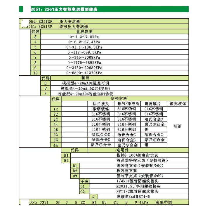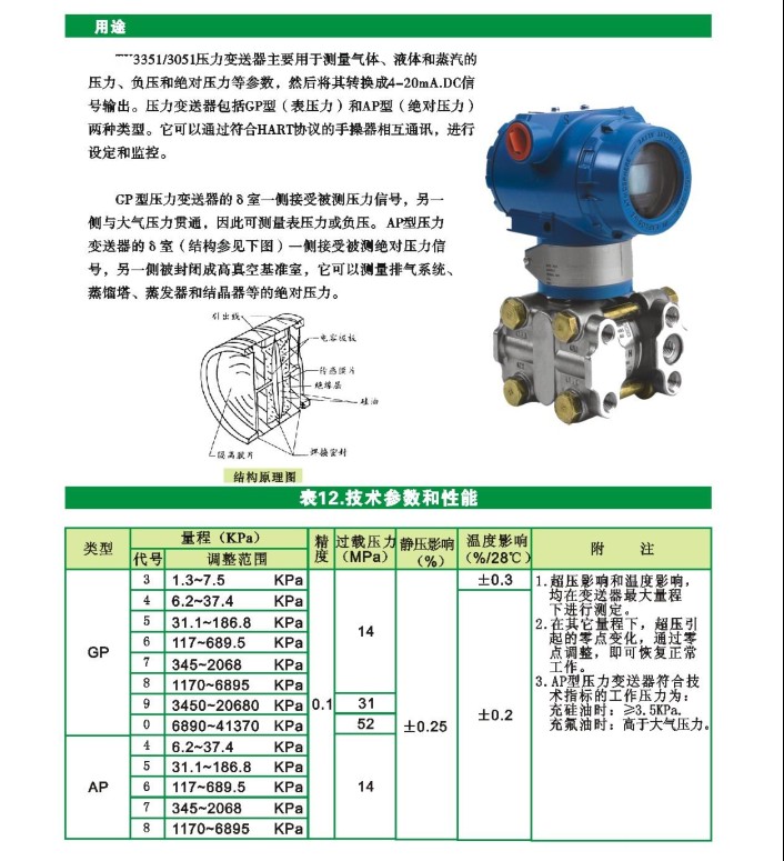 BLH3051:3351:压力智能变送器 TY3351/3051压力变送器主要用于测量气体、液体和蒸汽的压力、负压和压力等参数,然后将其转换成4-20mA.DC信号输出。压力变送器包括GP型(表压力)和AP型(压力)两种类型。它可以通过符合HART协议的手操器相互通讯,进行设定和监控。GP 型压力变送器的δ室一侧接受被测压力信号,另一侧与大气压力贯通,因此可测量表压力或负压。Ap型压力变送器的δ室(结构参见下图)一侧接受被测压力信号,另一侧被封闭成高真空基准室,它可以测量排气系统、蒸馏塔、蒸发器和结晶器等的压力。 压力变送器主要用于测量气体、液体和蒸汽的压力、负压和压力等参数,然后将其转换成4-20成信号输出。压力变送器包括GP型(表压力)和AP型(压力)两种类型。GP和AP型与智能放大板组合,可构成智能型压力变送器。它可通过符合HART协议的手操器相互通信,进行设定和监控。精度高,性能稳定。