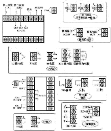 外给定控制,通讯方式RS232,输出方式继电器输出,PV输入类型为Pt100,SV输入类型为4~20 mA,一报警为上限报警,第二报警为下限报警,DC24V馈电输出,供电方式为直流24V供电。