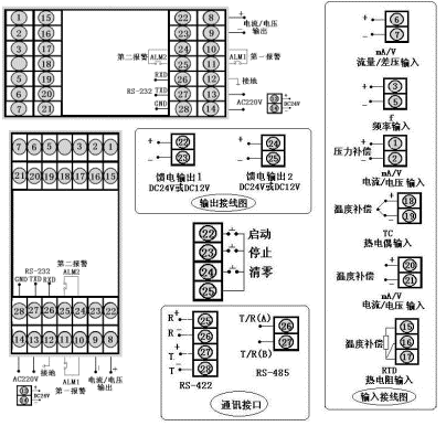 过热蒸汽带温度压力补偿的5位流量积算控制仪,流量输入类型为4~20mA,压力补偿输入类型为1~5V,温度补偿输入类型为热电偶K型,继电器控制输出,带RS-485通讯,带流量定量到控制报警输出,带下限报警输出,带DC24V馈电输出。