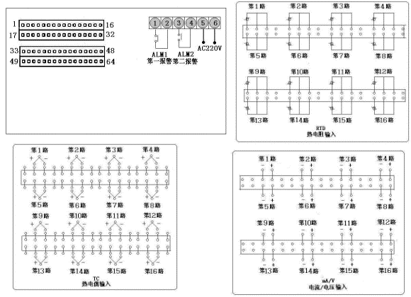 十六路巡检统一控制/报警输出,通讯方式RS485,继电器输出,输入类型CU50,一报警为下限报警,第二报警为上限报警,不带报警记忆功能,AC90~265V供电。