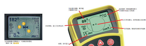 当参数(目标接近参数、电流强度、信号强度)数值不断上升,表明您在不断接近目标管线,当管线转向时,屏幕图示管线也会随之转向,屏幕导向箭头将即时显示左右走向。