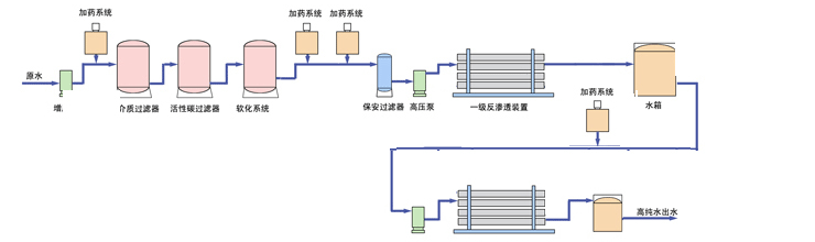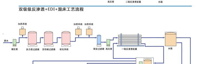 二级反渗透是采用一经反渗透的产出水作为原水,进行第二次反渗透的净化,产水电导率 ≤ 0.5μs 。各项指标均达到药典 2000 版的要求(不需蒸馏)。