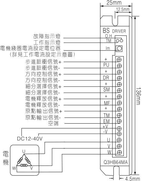 Q3HB64MA/B为等角度恒力矩细分型驱动器,驱动电压DC12-40V,电流在5.8A以下,外径42-86mm的各种型号的三相混合式步进电机。该驱动器内部采用类似伺服控制原理的电路,此电路可以使电机低速运行平稳,几乎没有震动和噪音,电机在高速时力矩大大高于二相和五相混合式步进电机。定位精度zui高可达60000脉冲/转。广泛应用于医疗机械、机器人、仪器仪表、雕刻机、激光打标机、激光内雕机等分辨率较高的小型数控设备上。