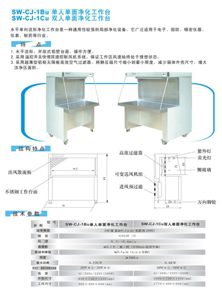 参数 SW-CJ-1Bu单人单面净化工作台 SW-CJ-1Cu双人单面净化工作台