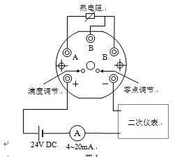 2. 校准方法: ①用电阻箱或其他信号源发生器代替热电阻按图1接线 ②按分度表,将电阻箱调至量程下限所对应的阻值,微调零点电位器,使电流表读数为4mA ③按分度表,将电阻箱调至量程上限所对应的阻值,微调满度电位器,使电流表读数为20mA ④调试完毕 (必要时重复②③步骤,使之满足要求)