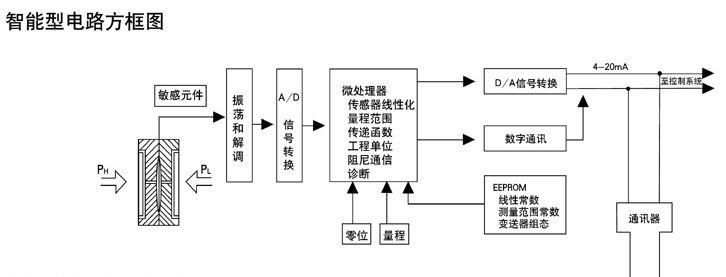 A/D转换器将解调器的电流转换成数字信号,其值被微处理器用来判定输入压力值。微处理器控制变送器的工作。另外,它进行传感器线性化。重置测量范围。工程单位换算、阻尼、开方,,传感器微调等运算,以及诊断和数字通信。
