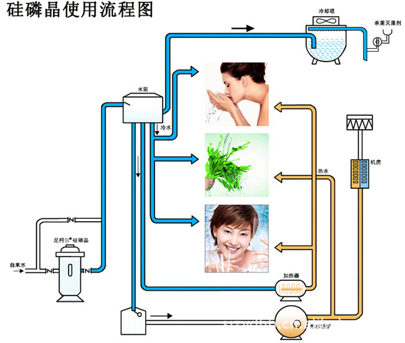 2、使用方法:生活饮用水系统管网另加加药罐,让饮用水流经加药罐后进入过滤系统后再进入管网系统即可;在工业循环冷却水系统补水池投放硅磷晶,让补充水全部流经硅磷晶后进入循环冷却水系统即可。