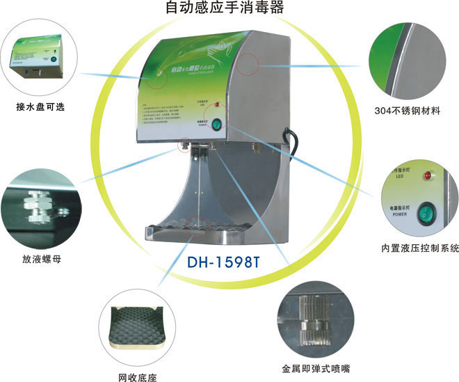 DIHOUR 牌自动雾化感应手消毒器是国内一款采用304不锈钢外壳面接触式的手消毒器,又称酒精喷雾器和自动净手器,该产品喷出的消毒液能达到完全雾化的效果,每次每秒喷出的液体仅为0.6到0.8毫升,避免了消毒液浪费的情形,同时该产品采用人性化设计,在液体加满的时候发出蜂鸣声提示,在液体即将没有的时候指示灯闪亮提醒用户加液,同时感应工作保护。