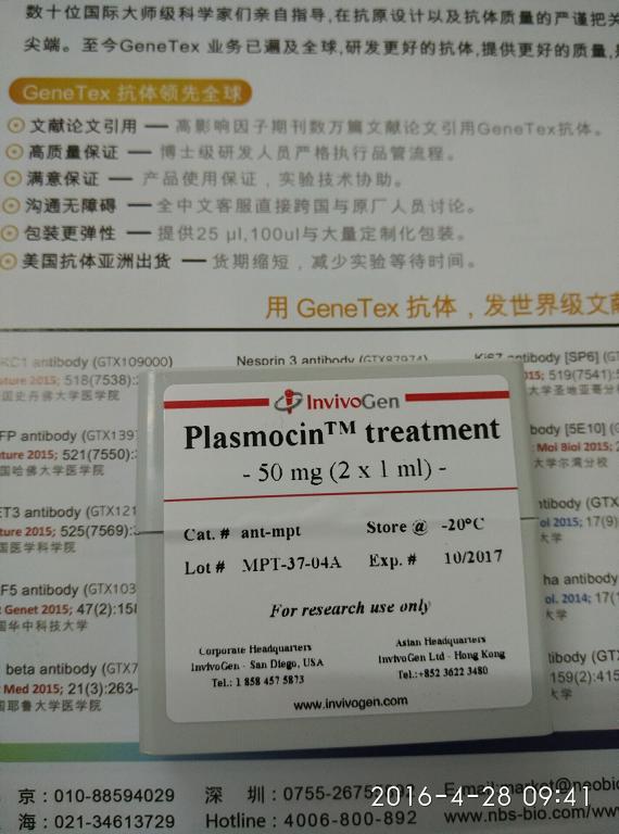 说明:支原体污染对于哺乳动物细胞培养是一个灾难性的问题,因为支原体污染可改变真核细胞的一些细胞学参数,从而导致实验偏差而获得不可靠的实验结果。支原体不易通过常规的光学显微镜观察到,所以在细胞培养过程中会长期存在不容易被察觉。在细胞培养中使用的常规抗生素如青霉素或链霉素对支原体无效,InvivoGen公司的支原体特异性抗生素可有效的预防和去除支原体。细胞培养中支原体感染发生率达到63%,支原体感染发生后能改变细胞的DNA,RNA及蛋白表达,又不能通过可视法对其进行检测,而且它对细胞的生长率影响较小,不易引起注意。Plasmocin™——支原体预防与去除利器:Plasmocin™是目前受科研工作者欢迎的支原体抗生素之一。其包含大环内酯物及对苯二酚两种主要成分,可有效作用于支原体复制的蛋白合成阶段和DNA复制阶段,只需两周即可清除支原体污染,并且不会影响细胞本身代谢;其特有的转运载体可以将有效成分转运到细胞内,故对胞内支原体和胞外游离的支原体都十分有效。此外,低浓度的Plasmocin™对多种革兰氏阳性菌和革兰氏阴性菌也有一定的清除作用。 Invivogen 公司的 M-Plasmocin 属于新一代杀菌抗生素,能强烈的作用于感染支原体的细胞,杀灭支原体。同时, M-Plasmocin 能以一种较低的作用浓度发挥广谱抗革兰氏阳性和革兰氏阴性细菌的作用,比如能作用于耐青霉素与链霉素的细菌,已经证实 M-Plasmocin 对真核细胞没有毒性。其中预防支原体污染 :货号为 ant-mpp ( Plasmocin™ prophylactic (25 mg) ),作用浓度为 5μg/ml 作用于常规的细胞培养基( 500 稀释)