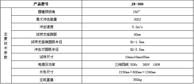 摆锤式冲击试验机型号:JB-300 用途:JB系列冲击试验机主要用于测定金属材料在动负荷下抵抗冲击的能力,以便判断材料在动负荷下抵抗冲