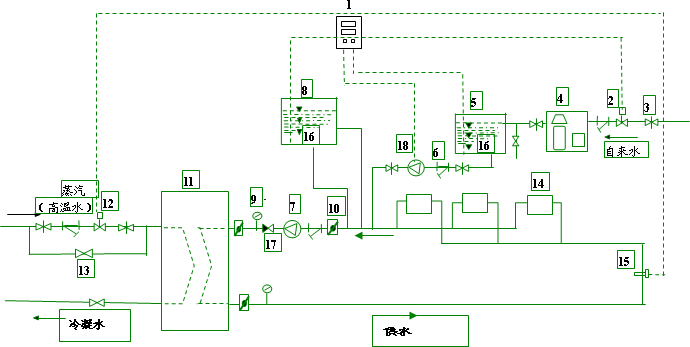 15 、温度传感器 16 、水位传感器 17 、止回阀 18 、补水泵