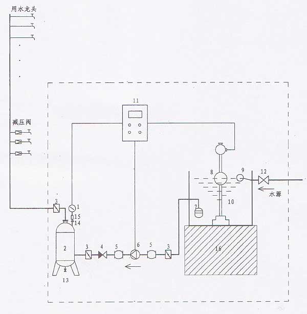 图中,1.压力变送器 2.储压罐 3.手动蝶阀 4.止回阀 5.橡胶软接头 6.水泵 7.底阀 8.水位控制仪 9.浮球阀 10.蓄水池 11.变频控制柜 12.截止阀 13.储压罐排污阀 14表阀1 5.水压阻尼器 16.蓄水池底座