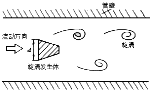 在流体中设置旋涡发生体(阻流体),从旋涡发生体两侧交替地产生有规则的旋涡,这种旋涡称为卡曼涡街,如图1所示。旋涡列在旋涡发生体下游非对称地排列。设旋涡的发生频率为f,被测介质来流的平均速度为U,旋涡发生体迎面宽度为d,表体通径为D,根据卡曼涡街原理,有如下关系式