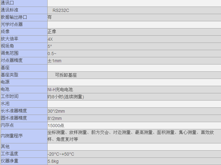 | 内测量程序 | 坐标测量、放样测量、前方交会、对边测量、zui高测量、面积测量、集心测量、直效放样、角度复对等 | ||||