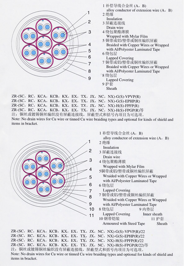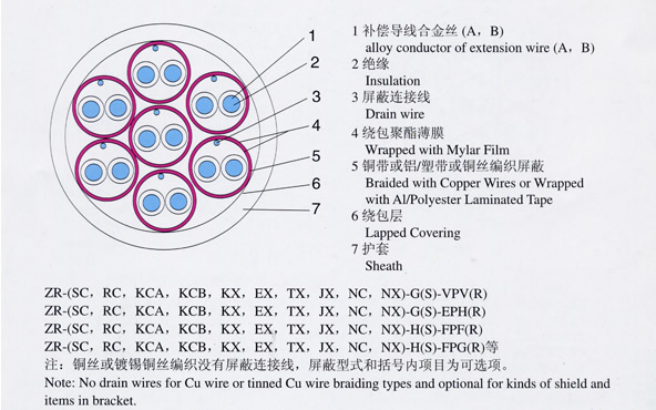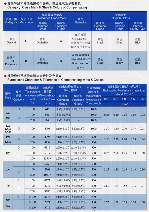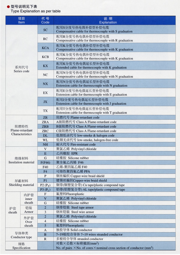 | 注:上述型号仅列出KX,其他如SC、KC、EX、BC、TX、JX只需改变型号一项即可, 阻燃型补偿导线型号前加ZR,ZR192为进口PFA材料, 屏蔽可采用镀锡铜丝屏蔽。 |