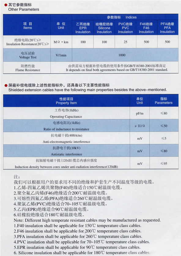 一般用聚氯乙烯缘和护套补偿导线或电缆具有优良的防潮、耐磨及阻燃特性;耐高温氟塑料缘和护套补偿导线或电缆采用连续挤出工艺,更有耐高温、耐寒、耐酸碱油水、不延燃、抗老化等优越性,产品质量高于国标GB/T4989-94(等效采用IEC584-3)的规定。
